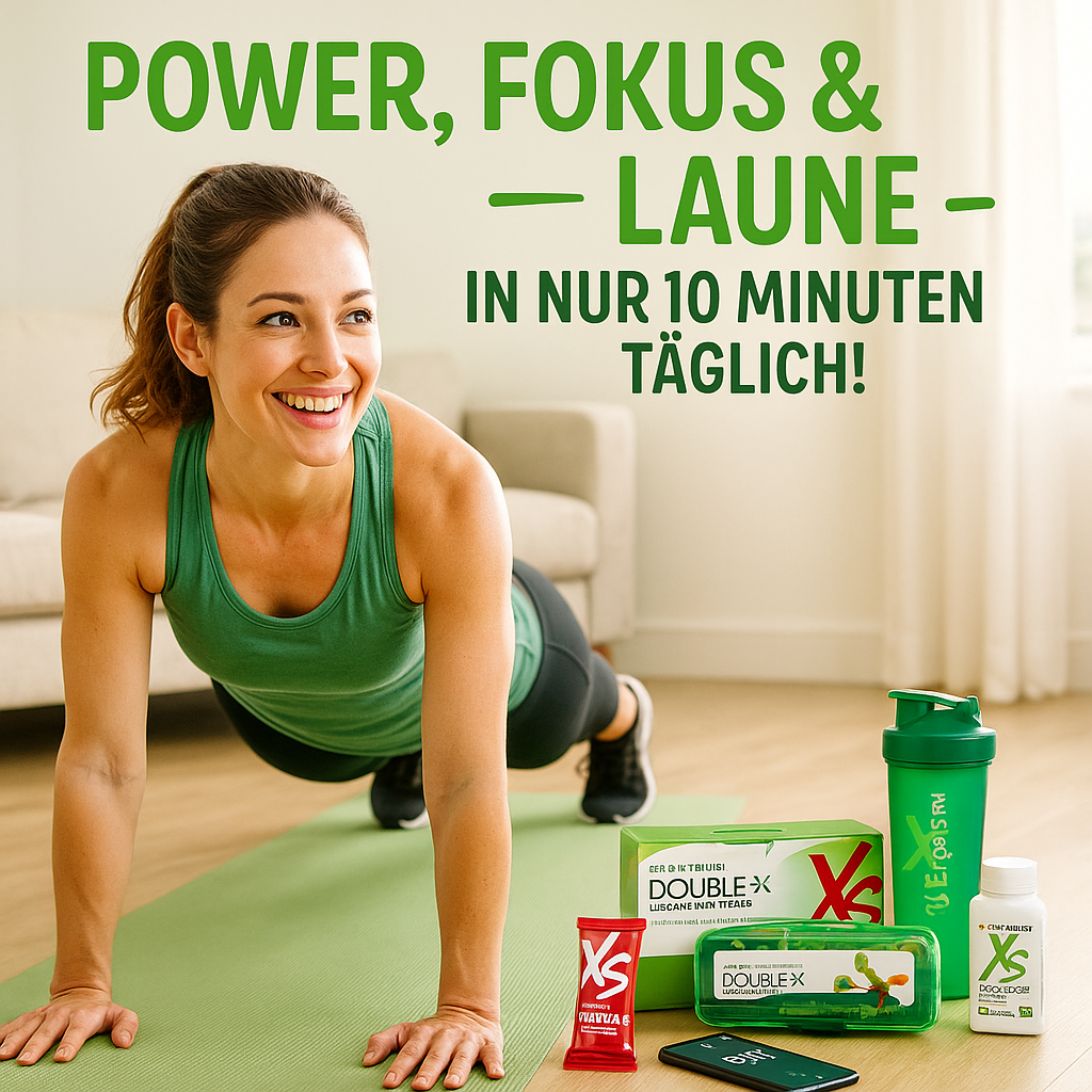 Das Set besteht aus hochwertigen Nahrungsergänzungsmitteln (u.a. Double X™, Omega-3, Balance Within™), proteinreichen XS™ Snacks und einem strukturierten Tagesplan mit 40-30-30-Ernährung. Ergänzt wird das Ganze durch ein kurzes, aber effektives 10-Minuten-Workout, das du jederzeit zuhause oder unterwegs machen kannst. Der Clou: Diese drei Säulen verstärken sich gegenseitig.