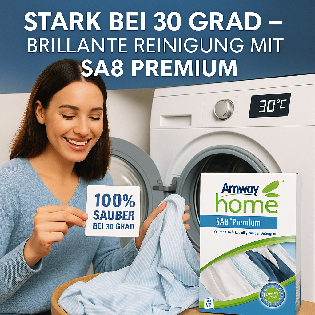Viele Waschmittel versagen bei niedrigen Temperaturen. Doch wer Energie sparen möchte, will nicht auf Reinigungsleistung verzichten. Genau hier überzeugt SA8™ Premium von Amway auf ganzer Linie. Denn dieses Waschmittel wurde für moderne Haushalte entwickelt, die Wert auf Nachhaltigkeit und Effizienz legen – und das bei Temperaturen ab nur 30 °C!